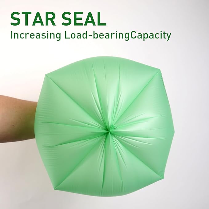 • 13 Gallon Large Mouth Trash Bags: These bags have a wide mouth design for better fitting of different shaped trash cans and loading of waste. The unique star seal design on the bottom of each trash bag prevents leaks, ensuring the compostable bags stay in place and allowing you to carry them with confidence.