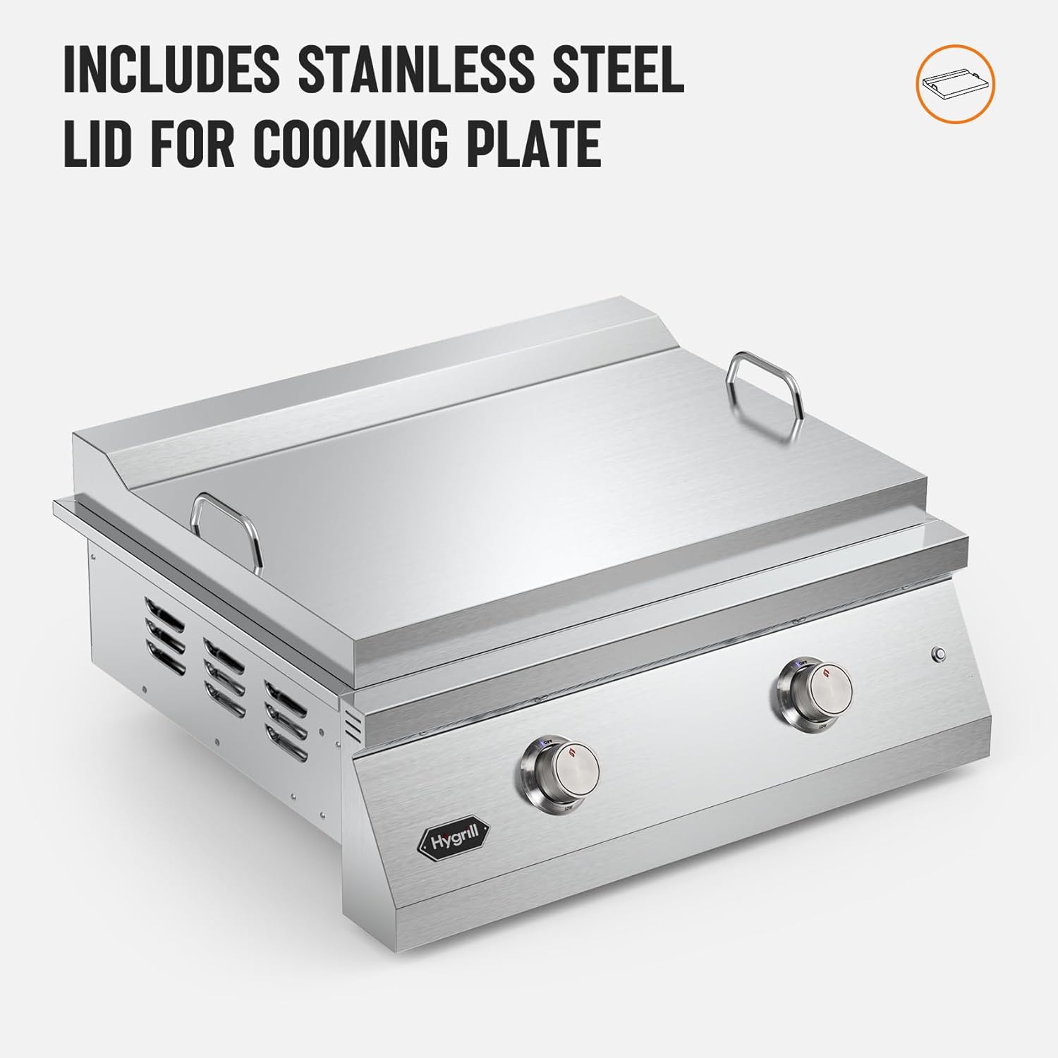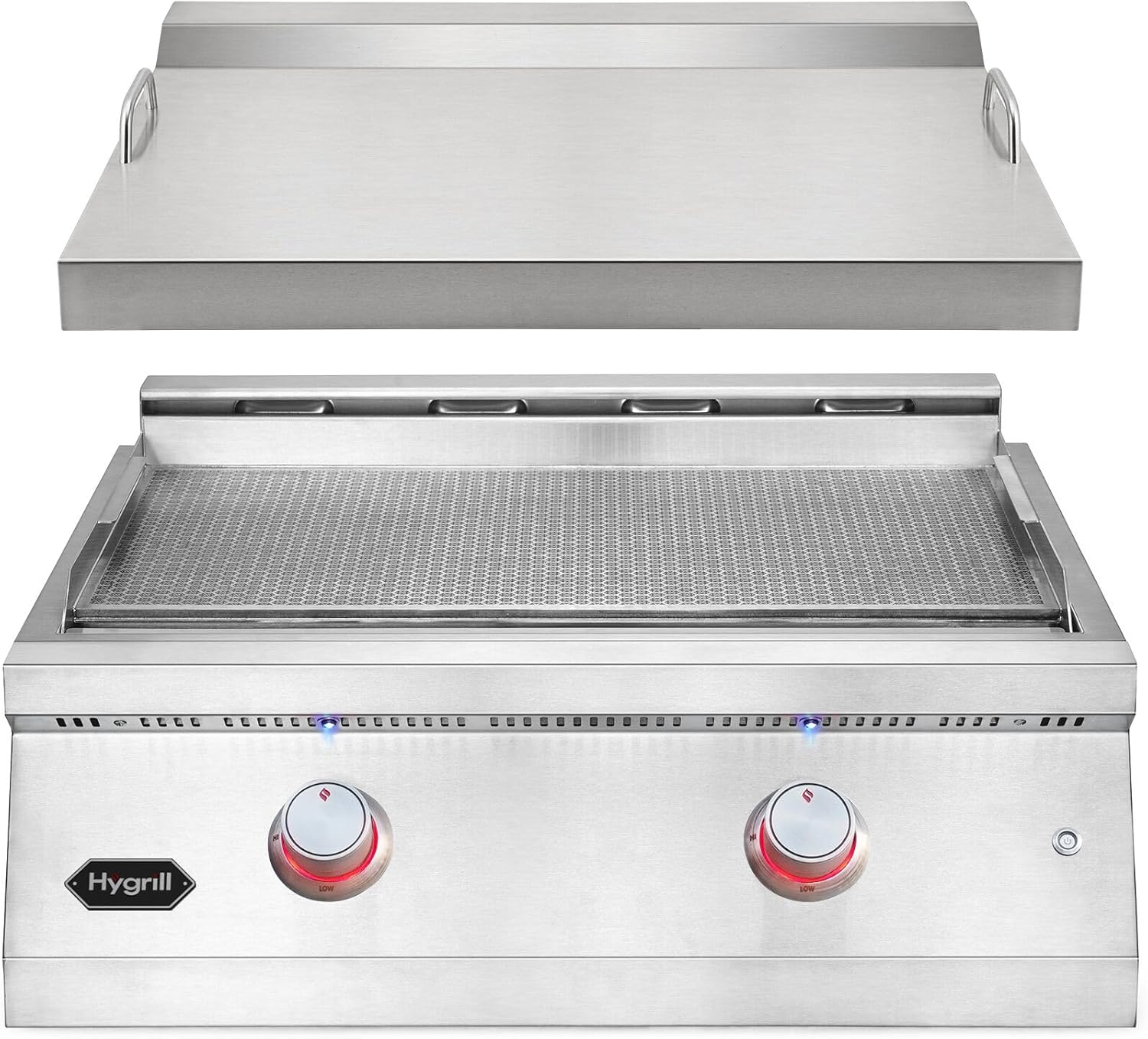 Hygrill 30-Inch Premium Built-In Natural Gas Griddle for Outdoor Kitchen, Durable 304 Stainless Steel 2-Burner Flat Top Grill with Lid and LED lights