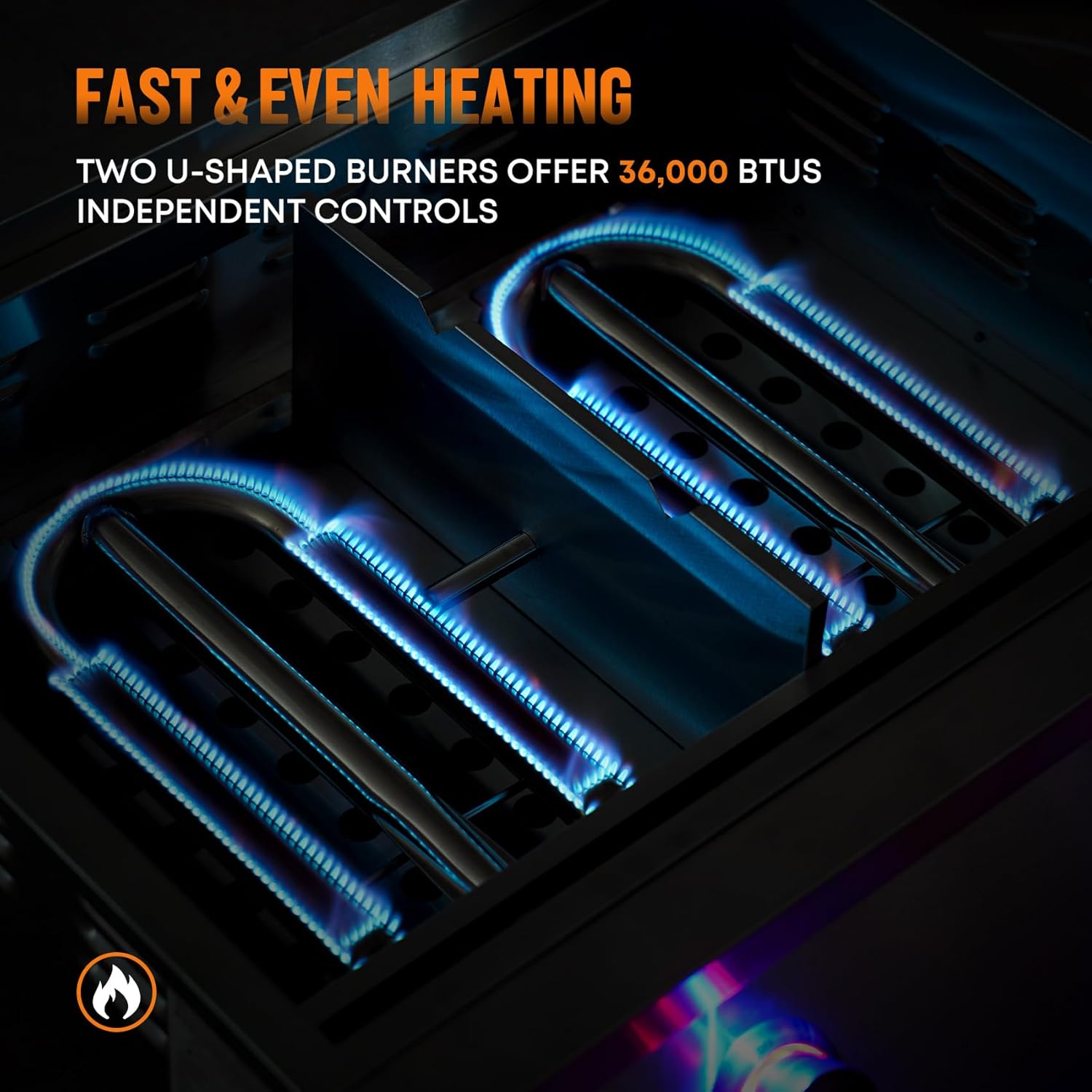 • 【36,000 BTUs for Quick Cooking】The outdoor kitchen griddle features 2 H-shaped steel tube burners which deliver a total of 36,000 BTUs across the 446 square inch cooking surface, so you can grill with confidence on the premium griddle.