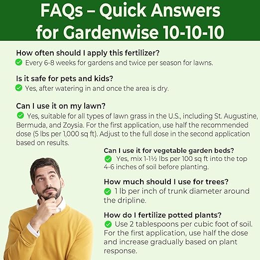 • 🌿 Balanced 10-10-10 Granular Fertilizer for Outdoor & Indoor Plants: All-purpose plant food with 10% Nitrogen, 10% Phosphorus, and 10% Potassium. Perfect for outdoor vegetable gardens, fruit trees, evergreens, shrubs, lawns, and flowers. Also great for potted plants and indoor gardening. One solution for all your plant needs!