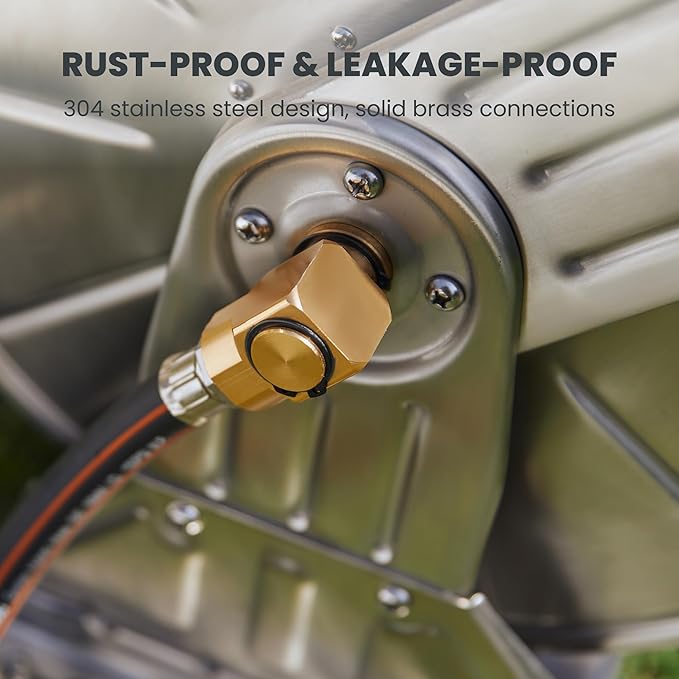 • Heavy Duty Construction: Industrial grade stainless steel makes the hose reel cart solid and durable, corrosion and impact restitant, and the solid brass connector features leakage-proof and wear-resitant, together ensuring a long service life.
