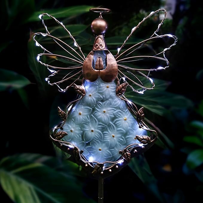 • 💎【ANGEL SOLAR LIGHTS】Angelic Portion Size 9.5x11.4inch,It is made of durable metal materials and glass. flower will not color fade easily even after being exposed to the sun. It is a suitable size that as a remembrance gift and cemetery solar decorations. This solar angel stake is perfect for lawn, patio,backyard,pathway,garden.