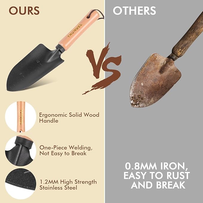 • Durable Stainless Steel - Heavy-duty stainless steel heads can withstand the toughest roots, rocks, and soil, sturdier than cast aluminum/coated/carbon steel, No need to worry about rusting and breaking during pruning, digging, weeding, etc. Mirror-polished process to make the tool get the minimal soil adhesion and easier cleaning.