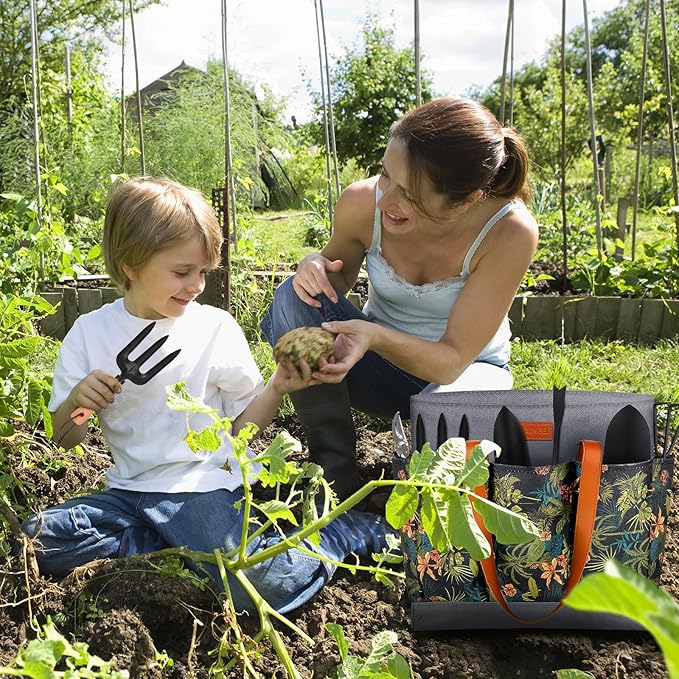 • Cover All You Need - 10 pieces garden tool kit has a handy tote bag, pruning shear, garden trowel, transplanter, weeder, hand fork, hand rake, kneeling pad, sprayer, garden gloves. All the gardening supplies are made of safe, non-toxic and harmless materials.