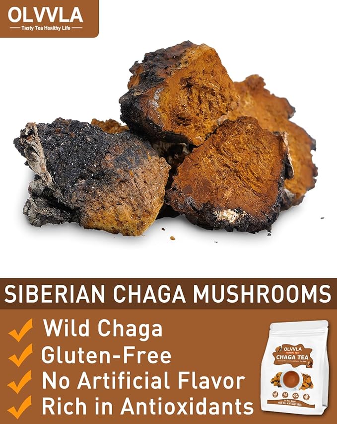 Olvvla - Chaga Tea Bags - 2.5g X 50 Count - 100% Wild Natural Chaga Mushroom Herbal Tea - Sourced from Siberia - Caffeine Free - Gluten-Free - Rich in Antioxidants