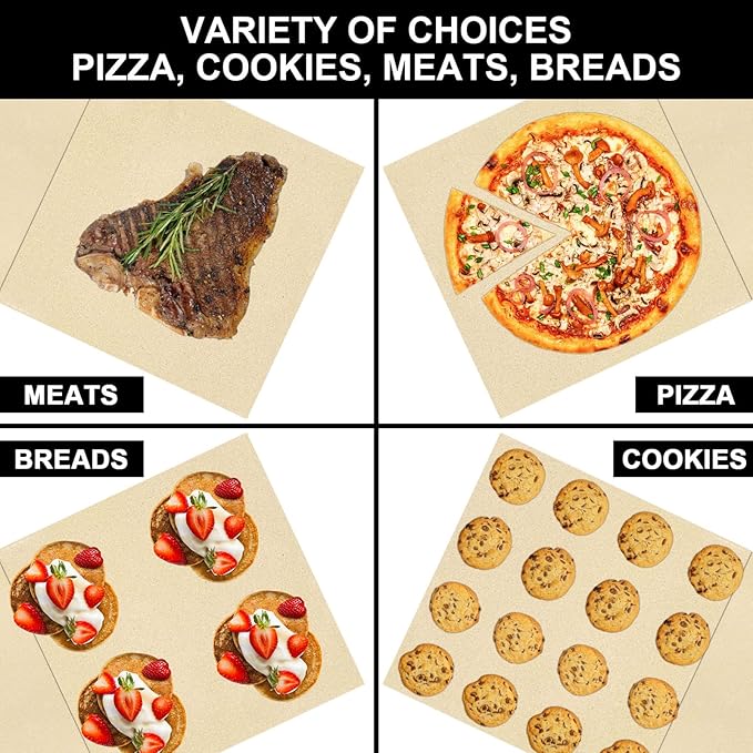 • Package contains two pizza stones (one T-shaped and one square). Square pizza stone measures: 16.7'' x 16.7''; T-shaped pizza stone measures: 16.7'' x 7.9''; Material: All natural Cordierite. Solid piece that cooks evenly. Can be used in home kitchens, family gatherings and parties. Can be used to bake bread, pizza, pies, cookies, and pastries, etc.