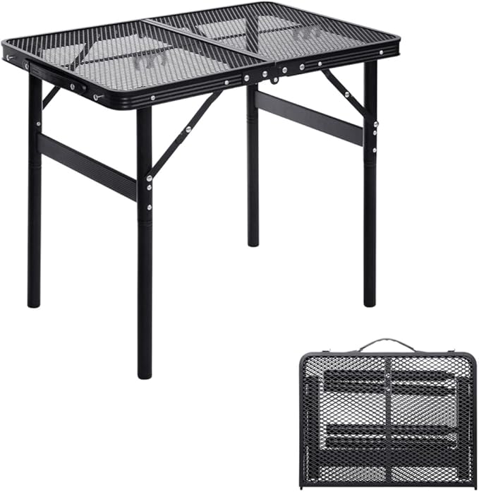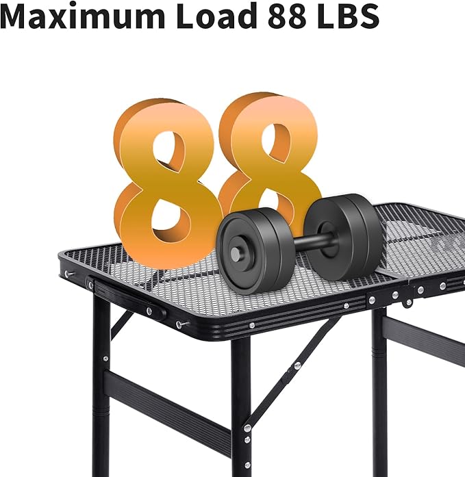 • Heat & Waterproof TOP - Moosinily portable grill table, with 1.6mm steel mesh top covered by powder painting, perform well no matter in heat or in water. The eage of the steel mesh has been polished so it would not be sharp for hands. The thicker 1050A aluminum alloy frame with diameter 25mm is lightweight, anti-corrosion and rust resistant which can use for most outdoor scenes in several year. Thickened 2 Support Rods and the tabletop support rod keep the table stable, this folding camping table has a load capacity of 88 lbs (evenly distributed). The desktop and frame can be quickly cleaned with a damp cloth, so you don't have to worry about stains