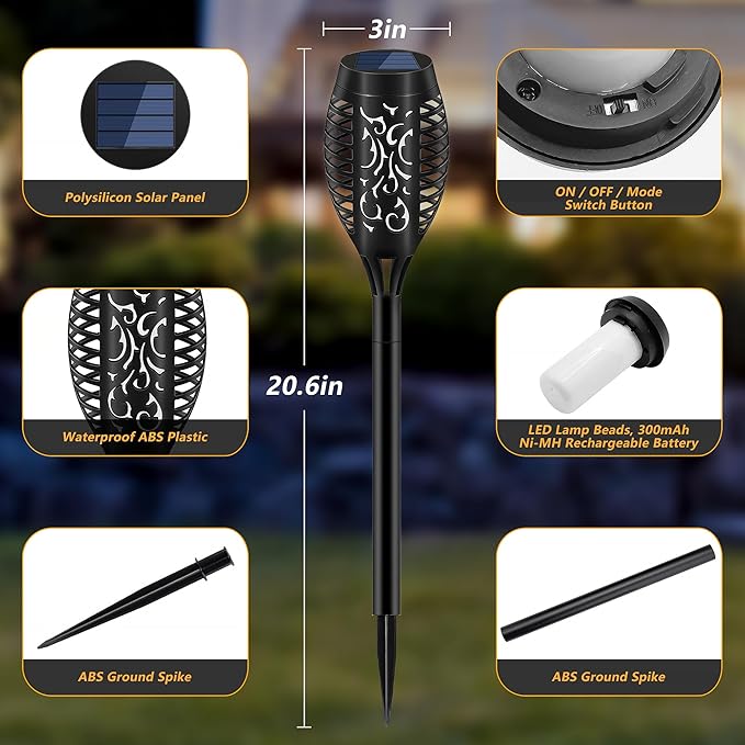 • 🔥【Solar Powered & Outdoor Decoration】 Solar lights for outside equipped with high-efficiency solar panel, solar torches can work up 6-8 hours in summer and 4-6 hours in winter after fully charged.
