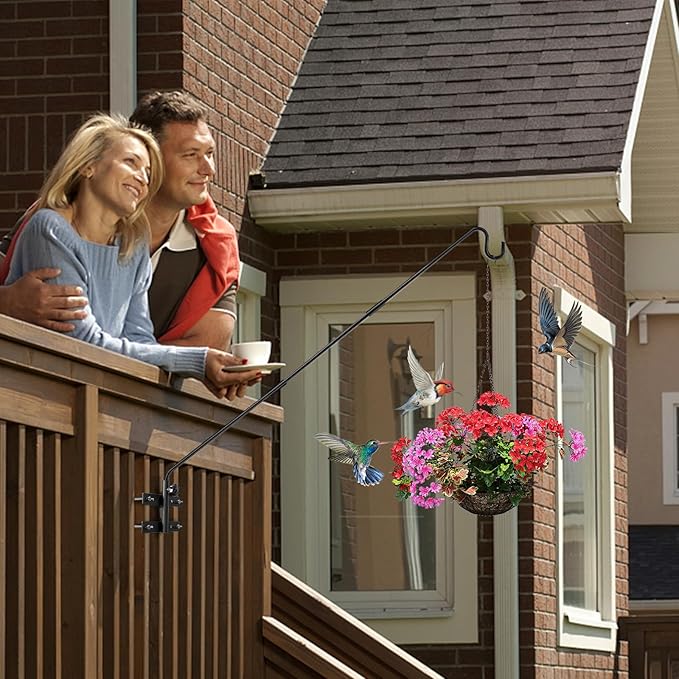 • INNOVATIVE DESIGN OF DECK HUMMINGBIRD FEEDER HANGER :Two sets of adjustable fixing clamp with 29-inch or 43-inch bird feeder pole allows you to place bird feeders or flower pots further away from your deck railing - Up high, or down low - whatever looks best for your deck and design.