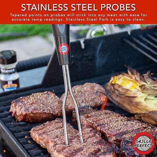 • DO YOU WANT EASY CLEANING? The Grille Perfect thermometer fork probe unit is made of 304 Stainless Steel, removable, and dish washer safe. The thermometer display unit should be cleaned with a soft damp cloth. Do not submerge the display unit fully in water.