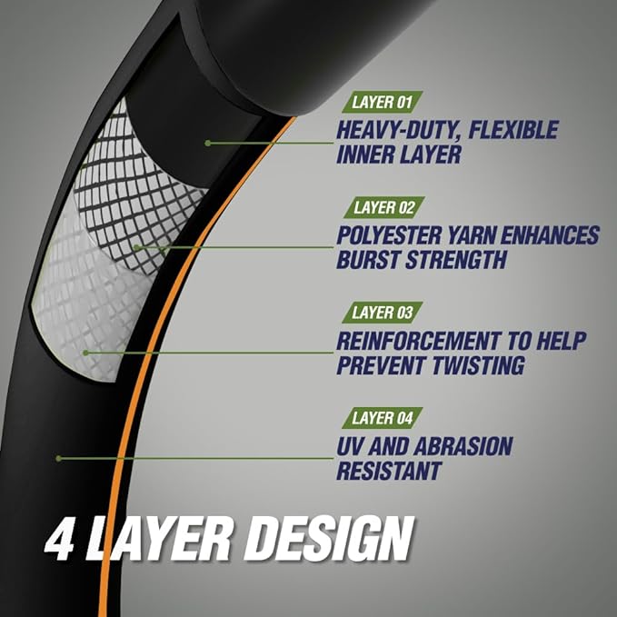• HEAVY DUTY 4 LAYER DESIGN: ultra strong, heavy duty hose to tackle any outdoor job; abrasion and crush resistant for maximum durability; UV and rust resistant with high quality anodized aluminum couplings for use in all weather