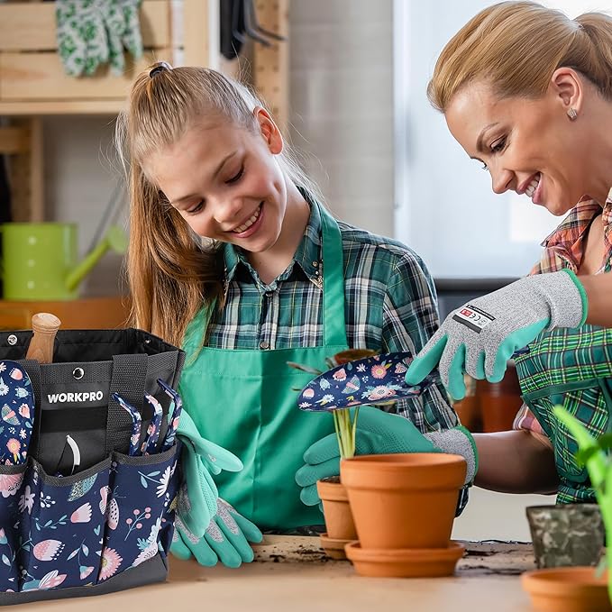 WORKPRO 5PCS Garden Tool Set, Aluminum Heavy Duty Gardening Tool Set with Garden Tool Bag, Outdoor Garden Hand Tools, Blue Insect and Flower