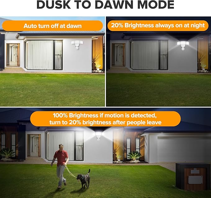 • Adjustable Design and Easy to Install: You can adjust the security light heads and the motion sensor head to different needs, which can provide extra brightness and more visible area. Coming with installation accessories, the security light can be be mounted on the wall in several wiring steps. IP65 waterproof rating ensures the light can work normally in severe weather