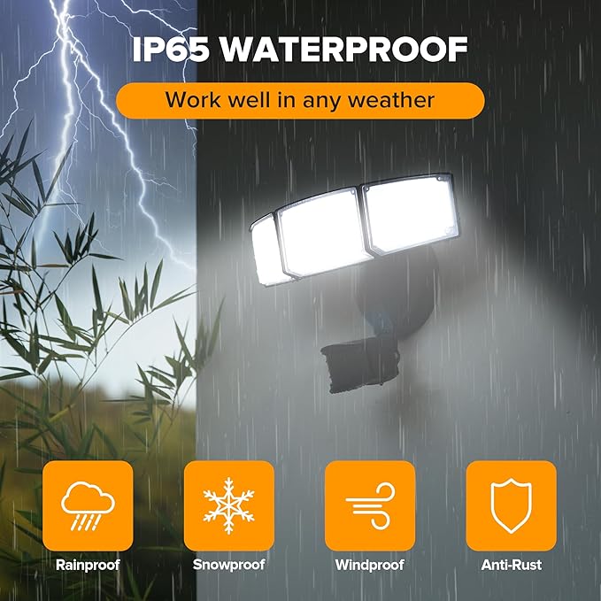 • Adjustable Design and Easy to Install: You can adjust the security light heads and the motion sensor head to different needs, which can provide extra brightness and more visible area. Coming with installation accessories, the security light can be be mounted on the wall in several wiring steps. IP65 waterproof rating ensures the light can work normally in severe weather