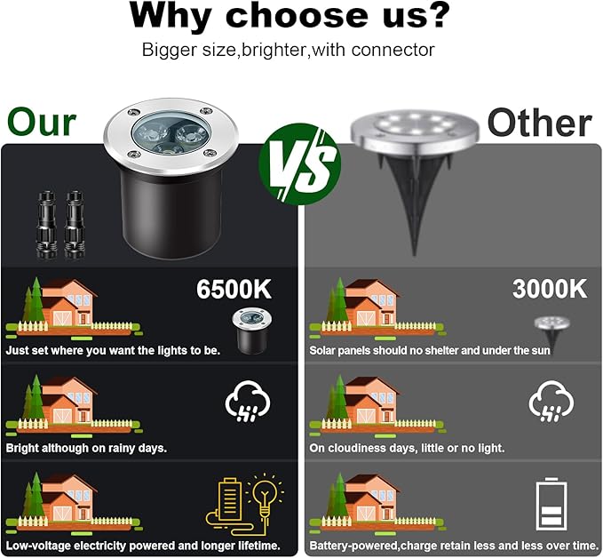 • ★Upgraded Bright LED Chip:4Pack 3Watt Inground Lights with 8pack wire connectors,300Lumens per lights,6500K Cool White light,high quality LED chip,lifespan up to 50,000 hours. Perfect for low voltage landscape lighting of pathway, garden, fence, deck, wall, pool, yard, patio.