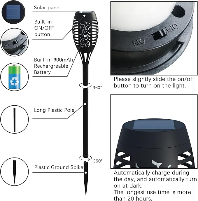 • 🔥【20Hrs Working Time & With Daylight Sensor】Solar christmas lights outdoor has a built -in large -capacity battery and high -efficiency solar panels, with a conversion rate of up to 20%. Through the daylight Sensor, solar torches with flickering flame can quickly charge in direct sunlight, The Solar torch lights lights up to 10-20 hours in summer and 8-15 hours in winter when fully charged. (Note: The charging time in the sun is at least 6-8 hours. The lighting time is affected by the weather)