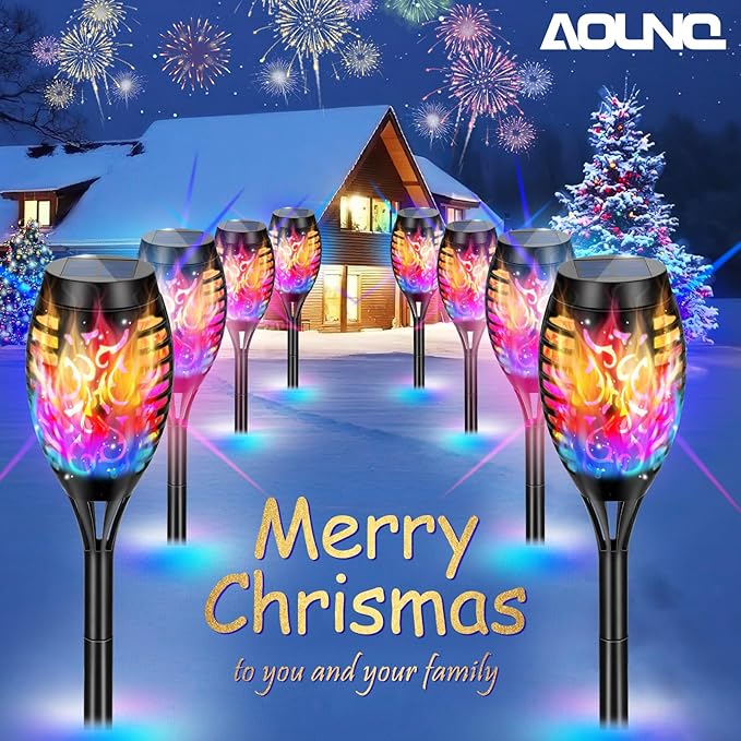 • 🔥【Gorgeous Color Dance Fames】: Happy Christmas! Our solar Christmas light with multi -color flame is an excellent choice for outdoor Christmas decoration.The solar Christmas lights are designed according to the real flames. While flashing the gorgeous multi -color dance flames, it will emit safe soft and enhanced emotional light.This makes solar lights can effortlessly become the talk of the neighborhood, transforming your house magically into a Christmas wonderland.