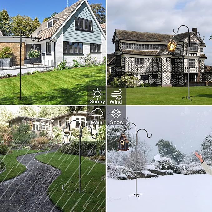 • 【Premium Quality】:The heavy duty shepherd hook is made of 1.5mm thick double hook steel pipe.The shepherds hook for bird feeder is surface with black powder coating to prevent rust,durable last for years.