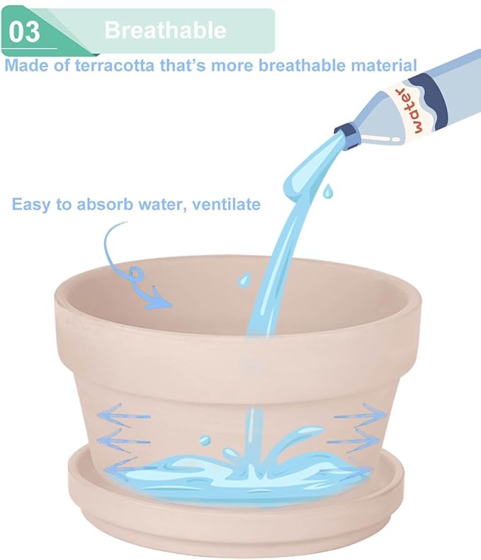 • Quality Materials: Terra cotta pots Making from high-quality clay through high-temperature baking, the walls of the pots draw the water out of the soil to help the soil dry quicker.