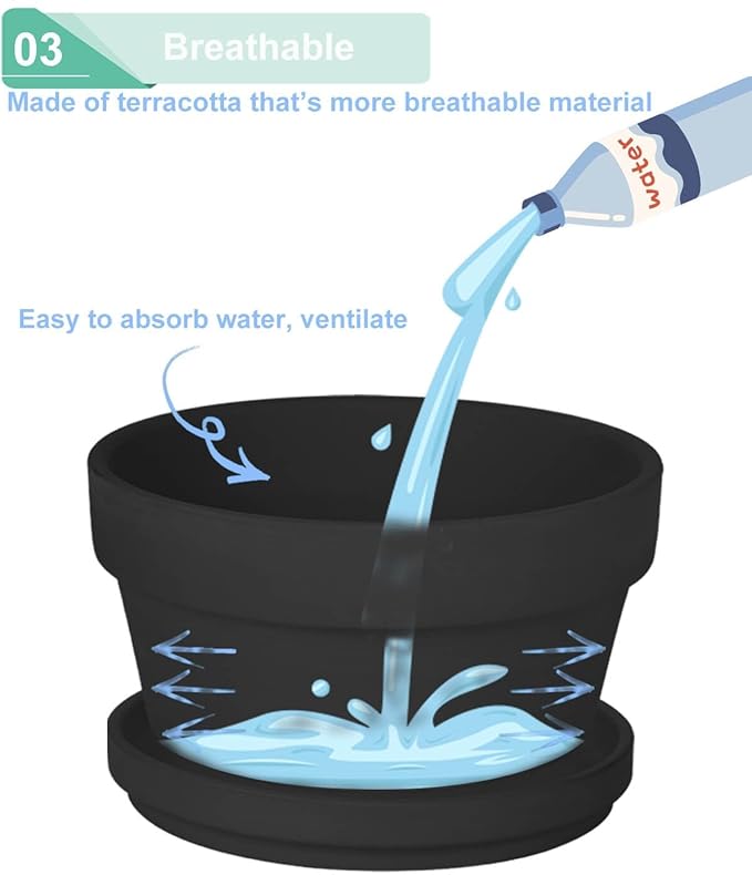 • Quality Materials: Terra cotta pots Making from high-quality clay through high-temperature baking, the walls of the pots draw the water out of the soil to help the soil dry quicker.