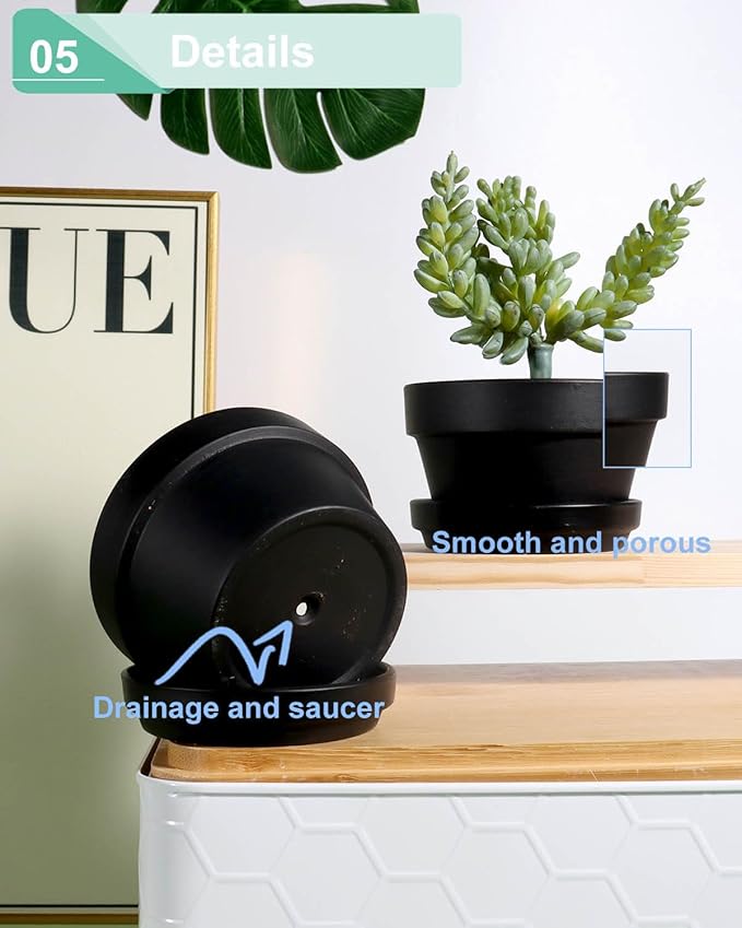 • Saucer&Drainage: Package included 6pcs terra cotta saucer to prevent dust and water from falling out of the drain, to keep the interior clean and to increase the beauty of the room the drainage outlet can prevent water accumulation and extend the life of the plant.