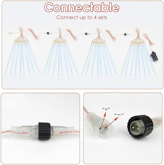 • Red and Green Meteor Shower Rain Lights: Each package contains 2 sets of connectable lights. Each set light has 8 tubes with 192 LEDs. Total 16 tubes with 394LEDs. The LEDs are double-sided inside the tubes which make it illuminates from any angle
