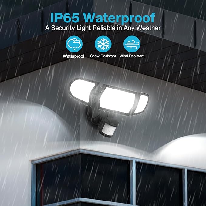 • Light Up Wide Coverage: This 9,000 lm motion lights for outside lights up yards, garages, driveways, and more. Its 3-headed adjustable design provides 270-degree coverage, illuminating up to 1350 square feet to enhance home security at night