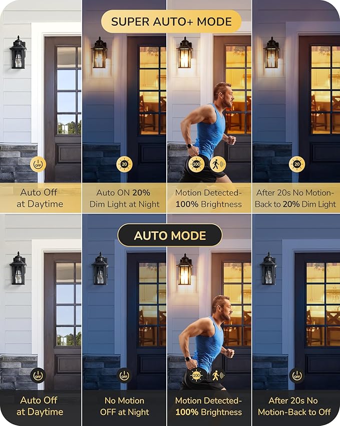 • [Upgrade 3 Lighting Modes] 3 lighting modes available, ① Auto+: 20%-50% brightness at night, 100% light once motion detected, 20-180s no motion back to 20%-50% dim light; ② Auto: off at daytime, auto on 100% light when motion detected, auto off after 20-180s no motion; ③ PC: auto off at daytime, auto turn on outdoor wall lantern at night
