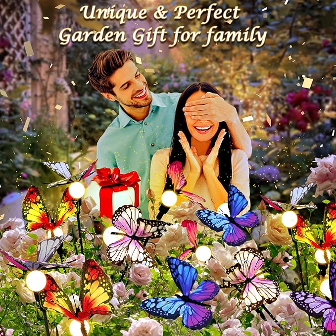• 【Perfect Garden Decoration Gift】The Solar Butterfly Lights with its beautiful and eye-catching design, durable construction add sparkle to your yard. Create a romantic and festive atmosphere, makes a perfect gift for any occasion, for patios, yards, lawns and sidewalks, for housewarming, Halloween, Christmas, New Years, Wedding, outdoor parties