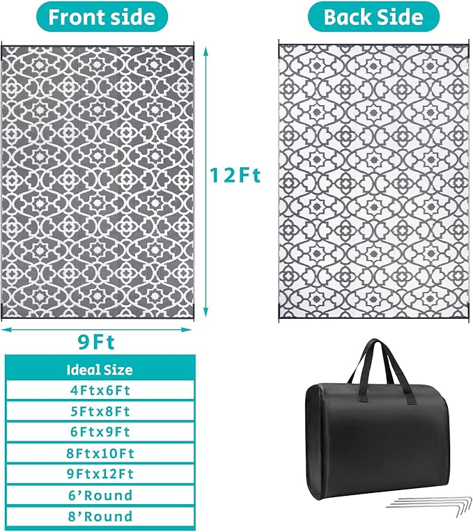 • XXL Reversible Outdoor RV Mats 9x12: The extra large 9x12 ft outdoor porch rug with unique boho floral design, which makes it easy to use on patio,camper, deck, beach, backyard. And this outside camping rug is reversible, two-sided design allows you to have two different looks.