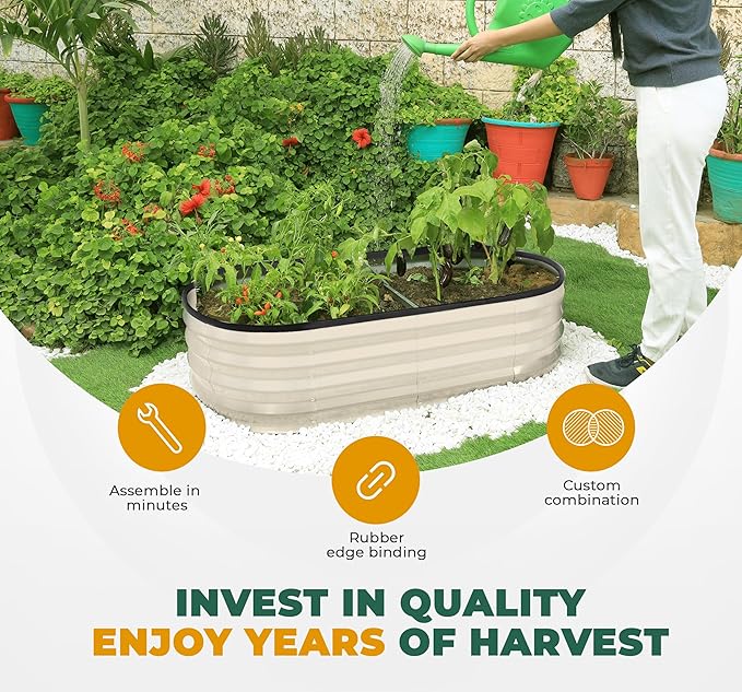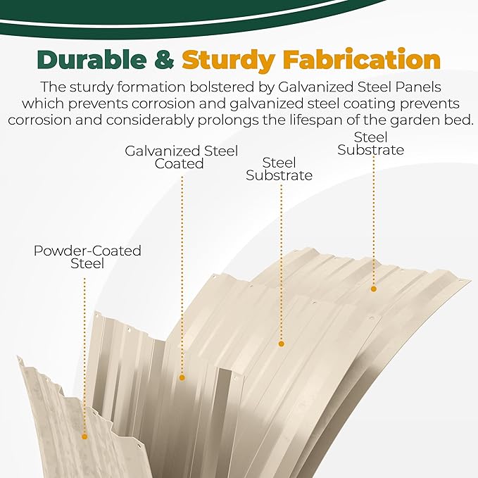 • Lightweight Galvanized Steel- The outdoor raised garden beds are made from lightweight galvanized steel, ensuring exceptional longevity and durability. Also, it prevents it from corrosion and rust, offering a long-lasting gardening solution. Moreover, the middle support strip provided exceptional strength to our lightweight Galvanized Raised Garden Bed.