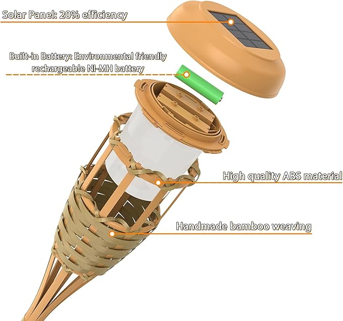• Adjustable Height: 2 lengthened high-quality tube parts included, the maximum height is 55.90 inches. Prevent toppling, the solar tiki torches can tolerate extreme weather conditions