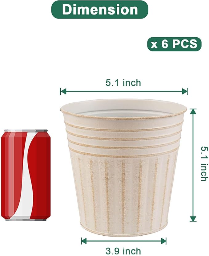 • 【Size of Metal Pots】There are 6pcs metal planters in a package, Topper opening diameter 5.1 inch, bottom diameter 3.9 inch, barrel high 5.1 inch.