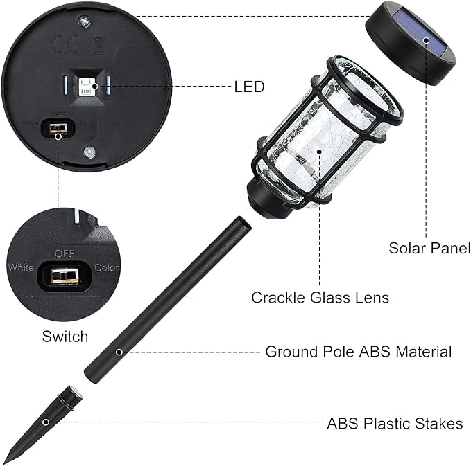 • Crackle Glass Solar lights: The solar pathway lights feature a crackle glass lens and black finish plastic frame. Classic design with warm white lighting is ideal to place in flower beds, landscaping, along pathways, or along driveways. Dia 2.7x18 inch.