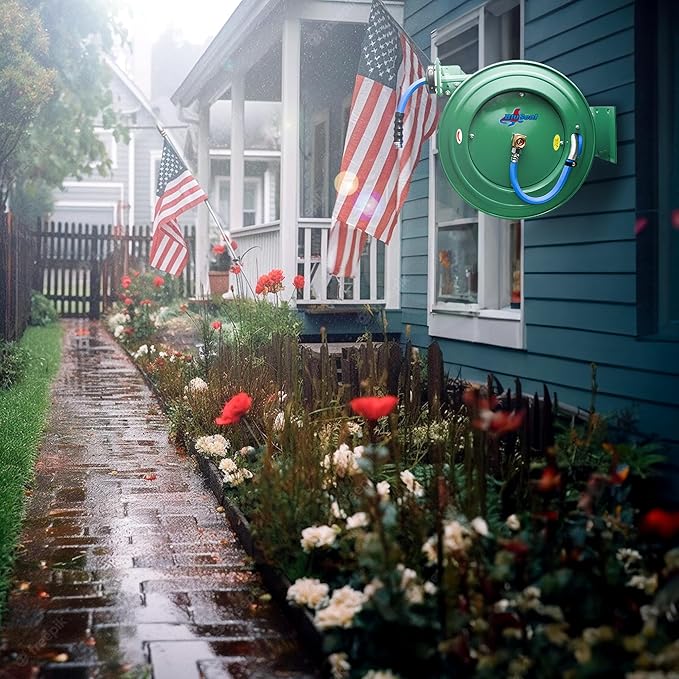 • NEVER COIL YOUR WATER HOSE AGAIN: keep your garden beautiful and gardening fun with this spring based retractable garden hose reel, made for home and institutional use but constructed with industrial quality powder coated steel parts, saves time, keeps your garden clean, avoids tripping hazards, looks great, just makes sense
