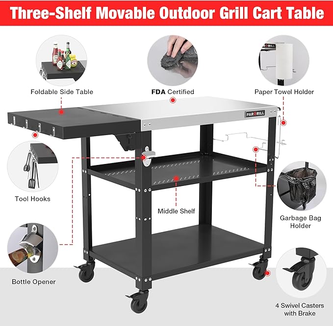 • Spacious and Convenient: With its large stainless steel countertop measuring L30''x W20'', along with a foldable side table providing an extension length of 14.4'', our outdoor grill table offers ample space for food preparation, plating, and serving. The three-layer storage design, equipped with essential features like a bottle opener, paper towel holder, garbage rack, and 4 hooks on the side, ensures everything you need is right at your fingertips, making outdoor cooking and dining a breeze