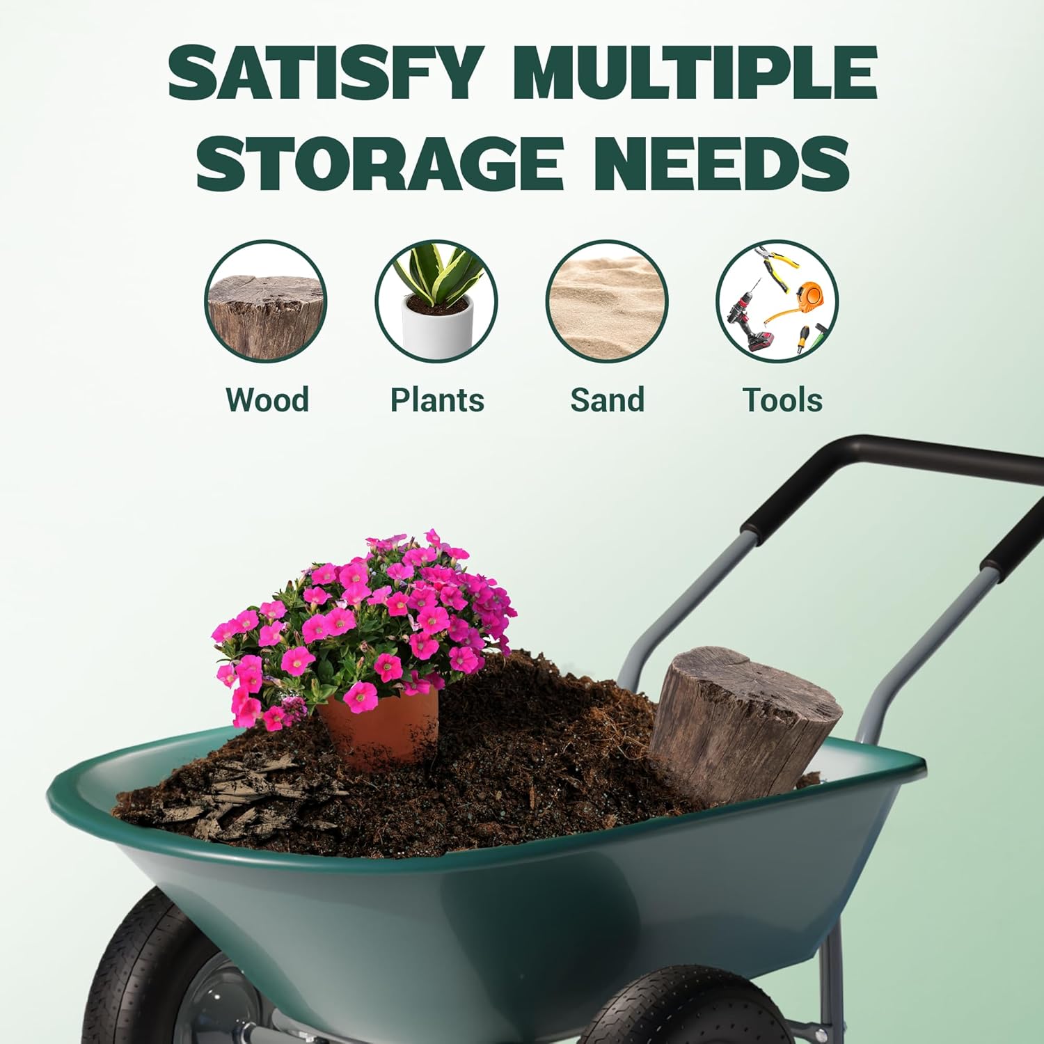 • 330 POUND CAPACITY WHEELBARROW: The strong push wagon can hold up to 330 pounds of soil, firewood, or tools; Equipped with durable wheelbarrow tires, ensuring smooth transport while helping maintain a clean and organized outdoor space