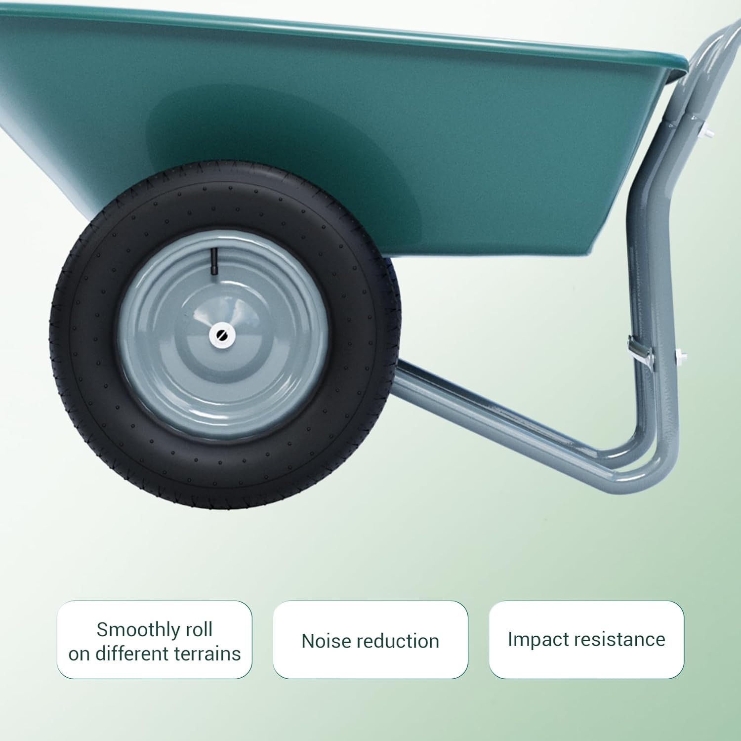 • STABLE DUAL WHEEL WHEELBARROW: The 2-wheel wheelbarrow ensures even weight distribution for a smooth, controlled ride; With 14-inch pneumatic tires, navigating uneven terrain becomes effortless, making the utility wagon ideal for any task