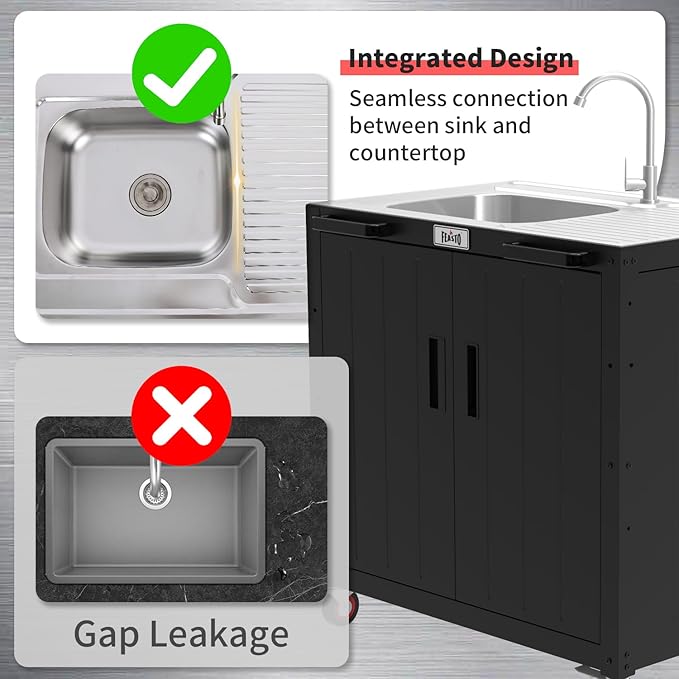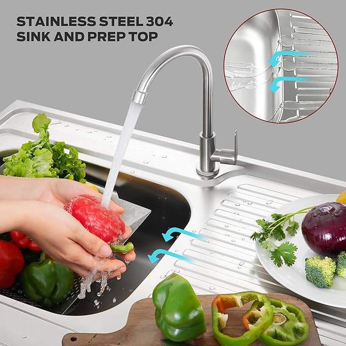 • 304 Stainless Steel: Table top is made of 304 stainless steel for long term using and easy cleaning. Can contact water or food directly in safe. Integrated sink connected with drainboard seamlessly. Perfect as your outdoor sink station