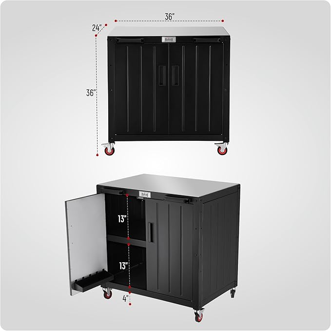 • Large Storage: L 35.4” x W 24” stainless steel table top efficient preparation and serving space.Extra 2 interior shelf storage cabinet features total 104 gallons.The large enough outdoor storage cabinet can improve efficiency for outdoor cooking