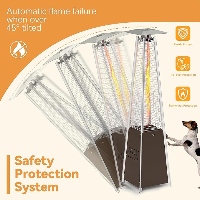 • 【Multiple Safety Protection】To avoid dangers of strong winds or accidental collisions, our pyramid patio heater has an auto-shutoff function that will automatically turn its flame off if the device is tilted more than 45 degrees. It also has an explosion-proof pipe and protective nets, ensuring you can use the outdoor heater with confidence. Additionally, each product has gone through 10,000 automatic flame-out tests before leaving the factory, so you don’t need to worry about safety issues.