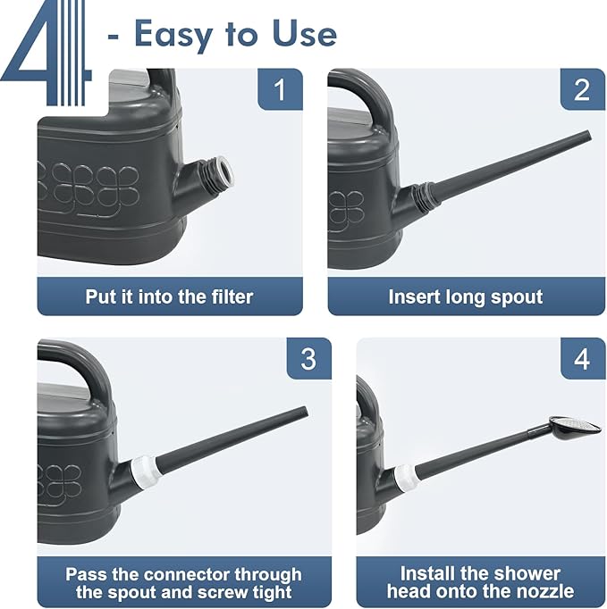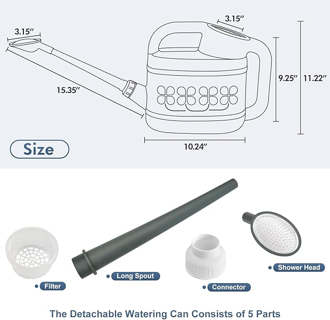• [PRECISE WATERING, WATERING FLOWERS WITHOUT WORRY]-Plant watering can has a removable long spout, easy to carry and store, when installing, pass the connector through the spout and screw tight, seals well with no leak. Long spout watering can easy to reach distant plants, watering easily without bending over or tilting it too much, it easy to control the overall water flow, directing water exactly where it is needed, allowing every part of the plant to fully absorb the water.