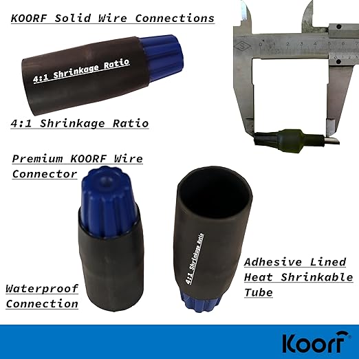 • ✔ AMERICAN OWNED AND OPERATED SMALL COMPANY: U-V resistant waterproof wire nuts that can withstand a 600-volt surge, for connections exposed to condensation, water, vapors, or dust, for use in outdoor lighting, outdoor wire and cable connectors to avoid short circuits in any exposed wiring. Efficiency: Shrink tubing able to shrink to 4:1 ratio. Easy size selection heat shrink connectors. A strong adhesive tubing prevents wires from being loose due to shaking or pulling. Copper to copper connections only. PREMIUM wire nuts for any INDOOR & OUTDOOR application. Quick connect wire connectors. Wire connectors heat shrink with Exclusive Features only from KOORF, your American Brand.