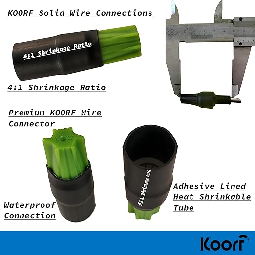 • ✔ AMERICAN OWNED AND OPERATED SMALL COMPANY: U-V resistant waterproof wire nuts that can withstand a 600-volt surge, for connections exposed to condensation, water, vapors, or dust, for use in outdoor lighting, outdoor wire and cable connectors to avoid short circuits in any exposed wiring. Efficiency: Shrink tubing able to shrink to 4:1 ratio. Easy size selection heat shrink connectors. A strong adhesive tubing prevents wires from being loose due to shaking or pulling. Copper to copper connections only. PREMIUM wire nuts for any INDOOR & OUTDOOR application. Quick connect wire connectors. Wire connectors heat shrink with Exclusive Features only from KOORF, your American Brand.