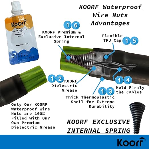 • ✔ UL LISTED: Easy-to-use waterproof wire connectors 50 Pack filled with premium KOORF dielectric grease, others products came filled with “Silicone Grease”, “Silicone Sealant” or even only “Silicone” with low-quality sealant, in few weeks that type of sealant will be evaporated or hardened leaving your connectors and wires open to a possible shortcut with all the risks, we only use our own KOORF Dielectric Grease to fill our products