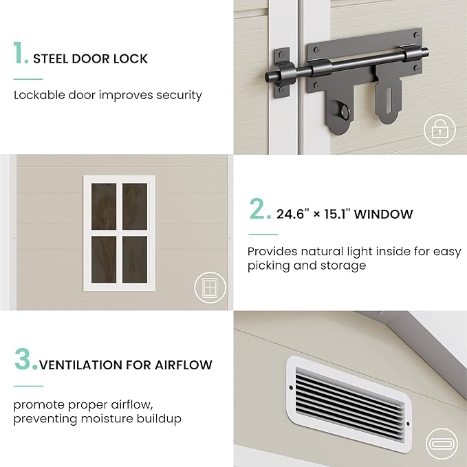 • STURDY FLOOR & WINDOW:Equipped with a sturdy floor, our outdoor storage cabinet effectively prevents moisture from seeping into the structure, safeguarding your belongings from potential damage caused by dampness, mold, or rot. The window design facilitates ventilation and natural light. It allows the visibility of tools from the outside and enhances the aesthetics of the shed