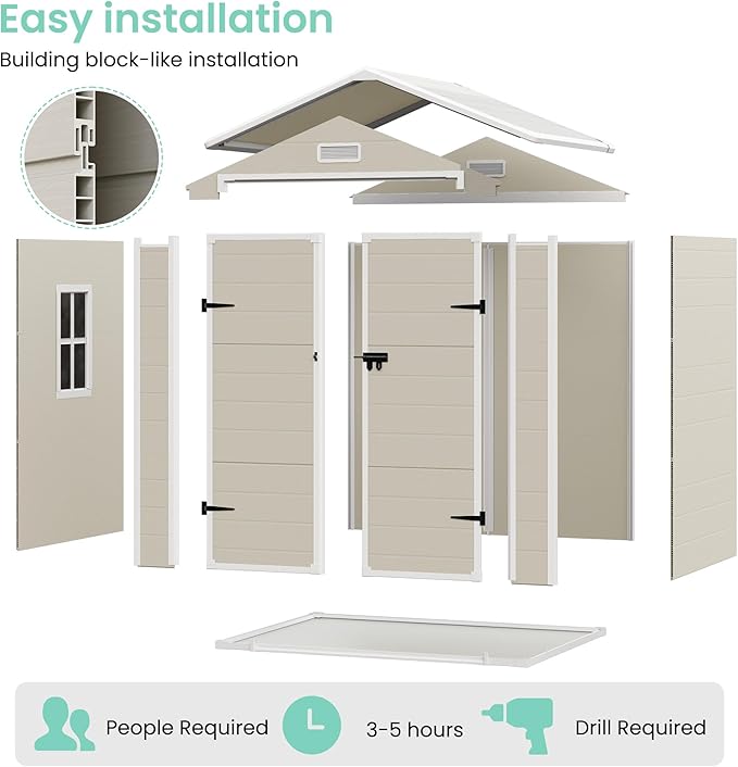 • EASY INSTALLATION:The building block-like installation method greatly reduces the installation difficulty as well as time. The screws are embedded to ensure beauty and safety. Our easy-to-follow instructions come with detailed illustrations, with clear numbering on all hardware and parts, the shed may need to be assembled with 2 persons in 3-5 hours