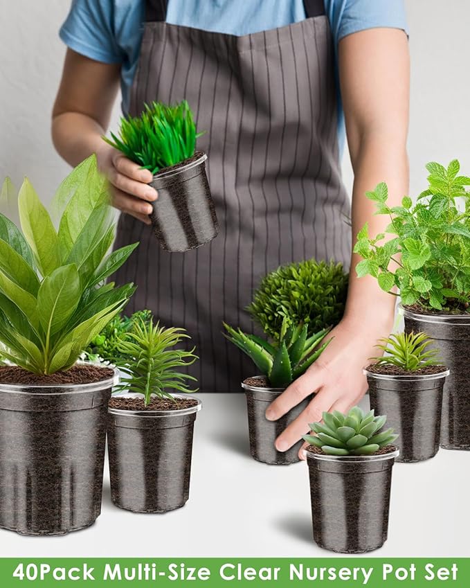 • 40Pack Clear Nursery Pots-The clear multi-size nursery pot set includes 40 pots in four sizes: 12pcs 3.5-inch, 12pcs 4-inch, 12pcs 5-inch, and 4pcs 6.5-inch. It offers the right pot for different plant types and sizes!