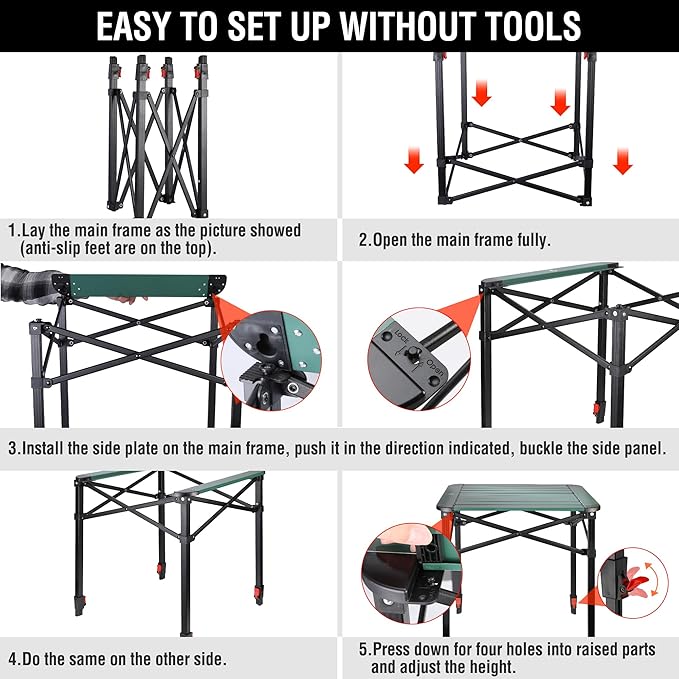 • Easy to Set-Up: With no tools required, this folding camping table is simple to set up, making it ideal for picnics, backyard barbeques, and camping trips. Suitable for all types of camping chairs and stools, its adjustable height makes it versatile