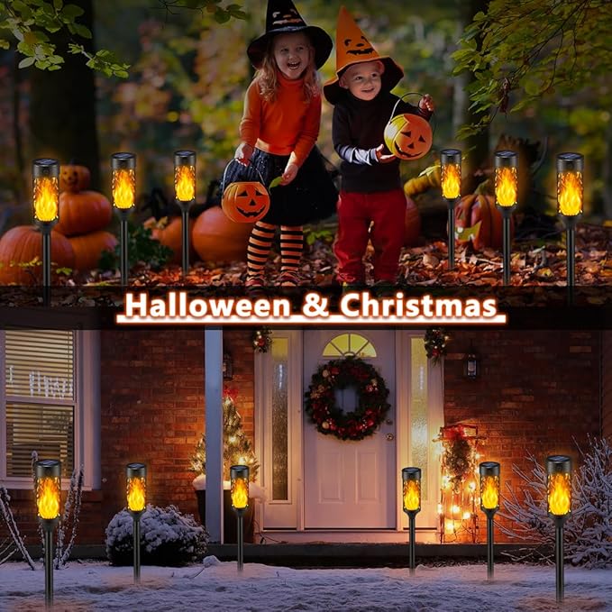 • Solar Outdoor Lights Waterproof: Garden lights solar powered waterproof equipped with enclosed design, can withstand most weather condition like rain and snow, which has better waterproof performance than general solar flame lights on the market. Attractive flickering flame torch lights will provide a warm and cozy atmosphere for your outside decor.
